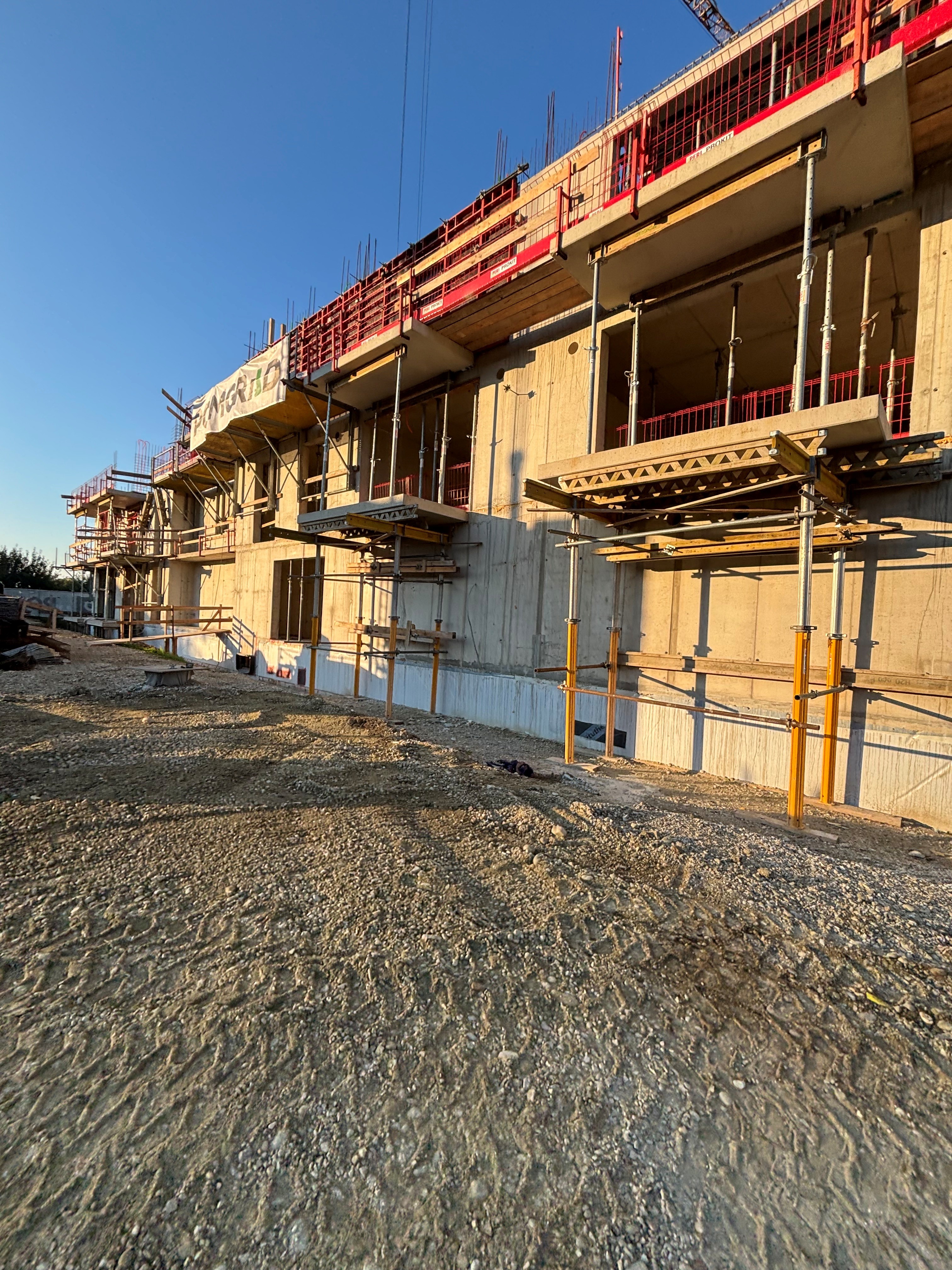 Pri gradnji se uporabljajo montažni armiranobetonski sistemi delovne enote ABI Lipovci za stopnišča in balkone. Stopnišča vključujejo elemente za prekinitev prenosa udarnega zvoka, balkoni pa sistemske elemente za prekinitev toplotnih mostov. V sanitarnih prostorih so vgrajeni Varisovi prefabricirani kopalniški in WC-moduli, ki se na gradbišču priključijo na instalacijske vode. Fasada objekta je kontaktna v svetlih tonih s kovinskimi ograjami, streha pa je dvokapnica z leseno konstrukcijo, pripravljena za morebitno namestitev sončne elektrarne.