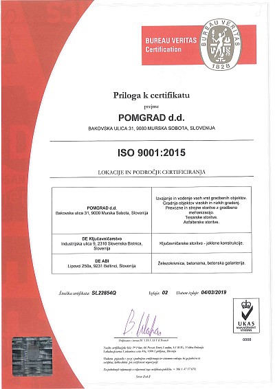 Gradbeno podjetje Pomgrad, d.d. je pridobilo še certifikat ISO 45001/2018 iz področja varnosti in zdravja pri delu in tako postalo edino gradbeno podjetje v Sloveniji te večje velikosti, ki ima pridobljene vse tri certifikate: ISO 9001/2015 za sistem vodenja kakovost, ISO 14001/2015 za sistem ravnanja z okoljem in ISO 45001/2018 za sistem vodenja varnosti in zdravja pri delu.